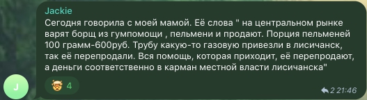 По словам пользователей сети, которым удалось связаться с Лисичанскам, в городе гуманитарная помощь удивительным образом оказывается на рынке. Причем стоимость продуктов едва ли по карману местным жителям.