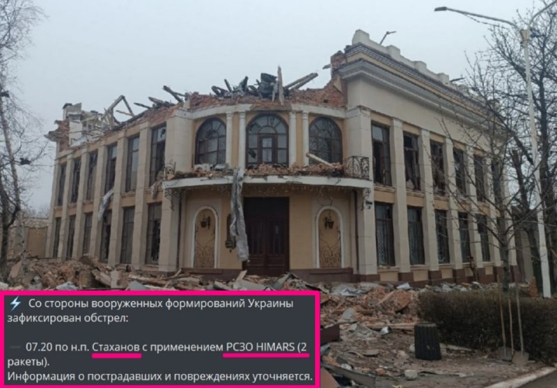 "Сегодня в 07:20 вооруженные формирования Украины из американских систем залпового огня HIMARS обстреляли центр Стаханова", - пишут оккупанты.