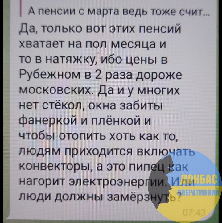 "Пенсий хватает на пол месяца и то в натяжку, ибо цены в Рубежном в 2 раза дороже московских", - пишут местные жители.