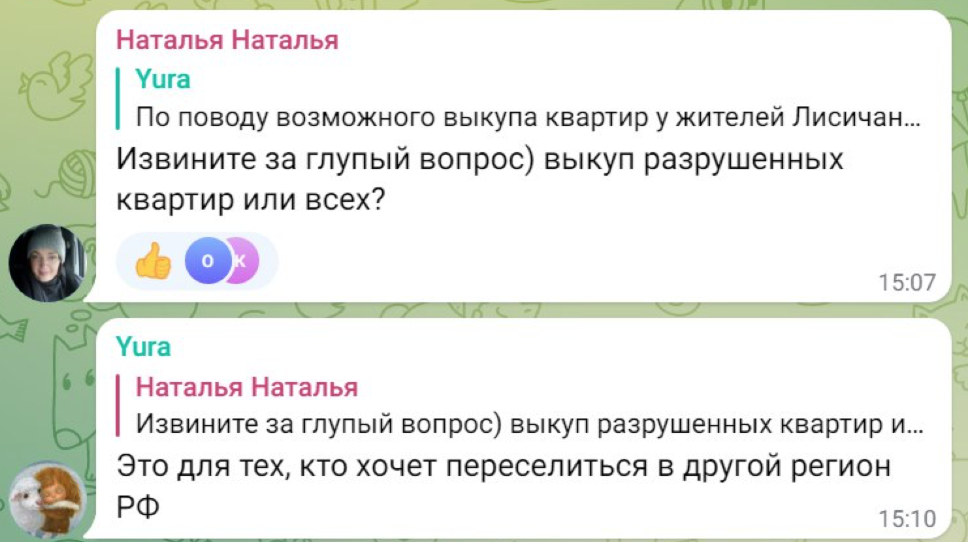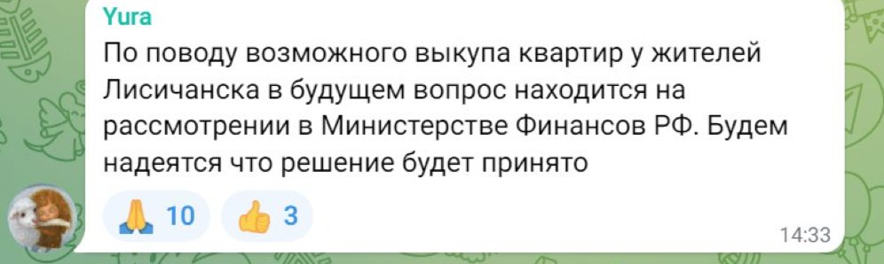 Как можно заключить из обсуждения, вопрос о "выкупе" сейчас рассматривается российскими властями. "Выкуп" предполагает переселение в другие регионы РФ. Кроме того, людей интересует вопрос "подселения", ведь может оказаться, что квартира уже занята, и где в такой ситуации жить собственнику - непонятно.