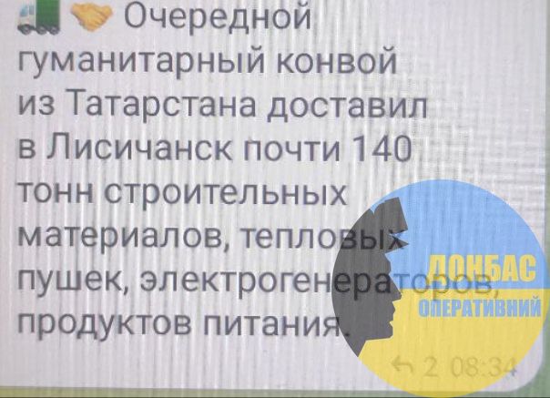 "В Лисичанск доставлен очередной гуманитарный конвой из Татарстана. Доставили тепловые пушки, генераторы, продукты питания", - сообщают оккупанты.