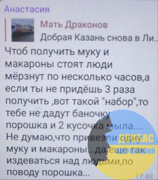 "Чтобы получить муку и макароны, люди стоят мерзнут по несколько часов, а если не придешь 3 раза, то не получишь баночку порошка и 2 куска мыла", - пишут очевидцы.
