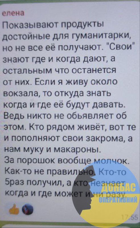 "Свои" знают где и когда дают, а остальным, что останется. Опять привезли типа 5 грузовиков. И опять все уйдет свату-брату и на рынок", - жалуются лисичане.