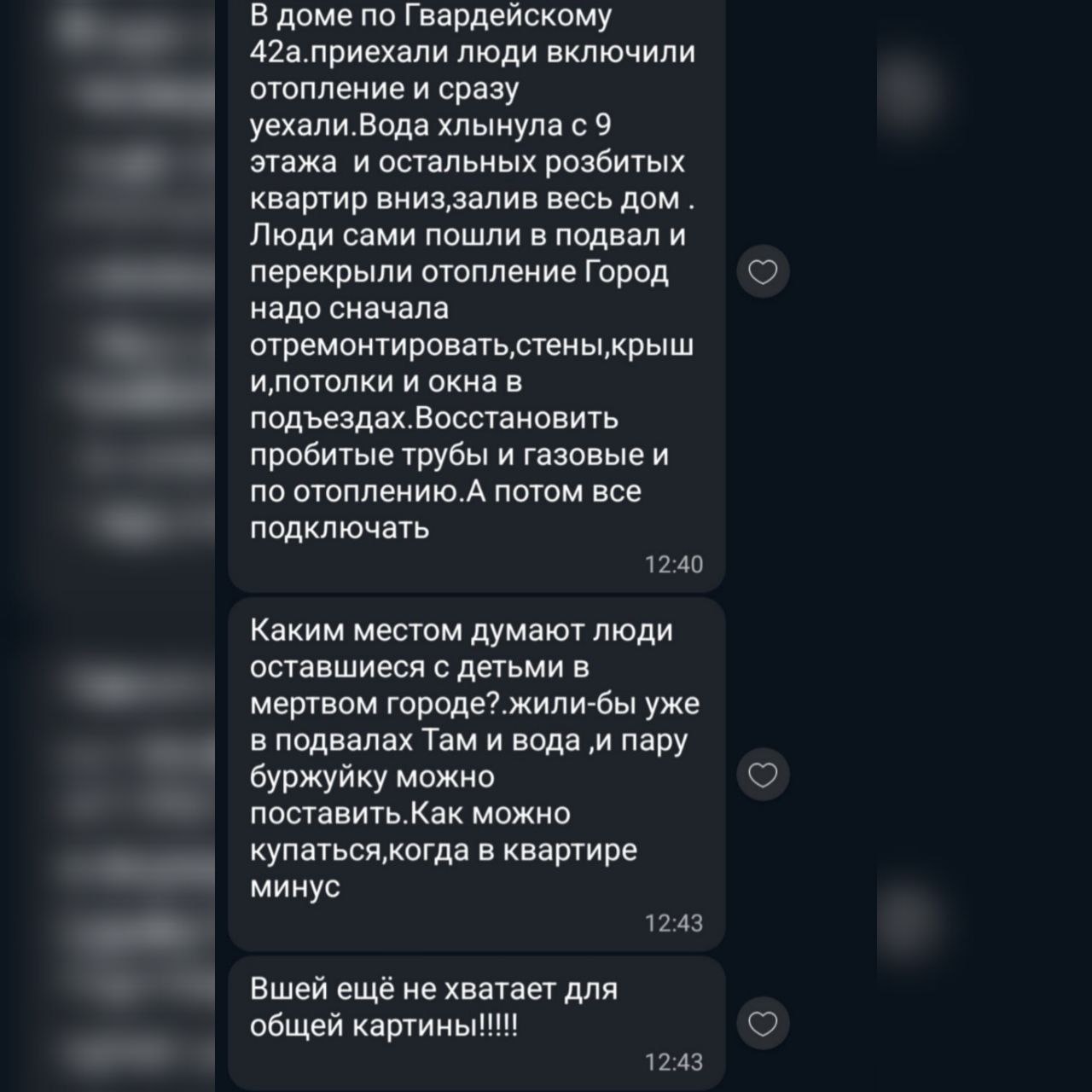 По словам пользователей сети, коммуникации в городе к зиме не готовы. Попытка включить отопление обернулась потопом. Очевидно, необходимо комплексное восстановление. Но кто будет этим заниматься? Новоиспеченным "властям" не хватило времени для того, чтобы хоть немного привести город в порядок. А люди вынуждены замерзать в квартирах, без возможности элементарно искупаться. Отмечается, что среди тех, кто остался в Северодонецке, есть дети, есть старики, есть те, кто обречен не пережить зимние морозы.