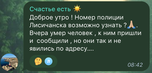 "Правоохранители" в Лисичанске - похоже, мифические существа, достучаться до которых очень сложно. Просто вызвать по телефону проблематично, так как попробуй еще найти номер телефона. По словам пользователей сети, даже если непосредственно и лично сообщить по месту, "полицейские" могут не удосужиться прийти в случае смерти человека дома, хотя это стандартная процедура.