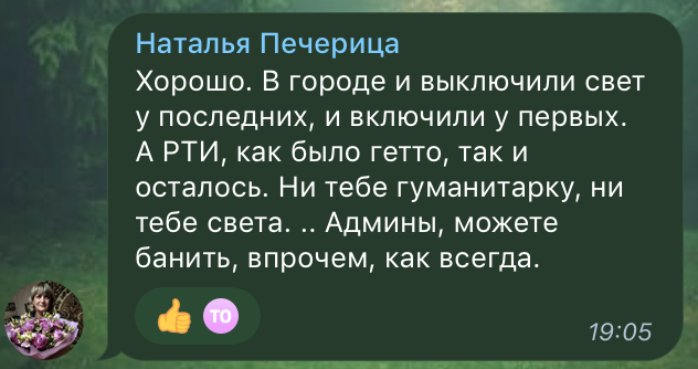 Напомним, ранее пользователи сети сообщили о том, что в городе появились намеки на восстановление электроснабжения - пробные включения. Даже если это и правда, события происходили в центре. А вот другие районы остаются в темноте, в частности - РТИ.