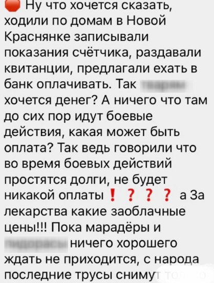 Как пишут жители Новокраснянки, по домам ходили работники коммунальных предприятий, собирали показатели счетчиков и предлагали съездить в банк и оплатить квитанции. Хотя «новая власть» сообщала местным жителям, что во время военных действий в регионе все долги за коммуналку будут списывать и оплачивать их не нужно.