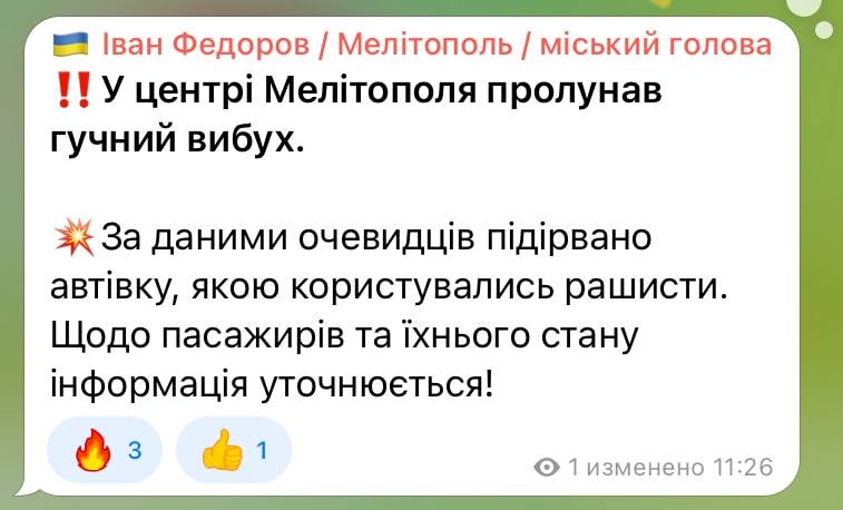 "По данным очевидцев взорван автомобиль, которым пользовались рашисты. Что касается пассажиров и их состояния, информация уточняется", - сообщил мэр в Telegram-канале.