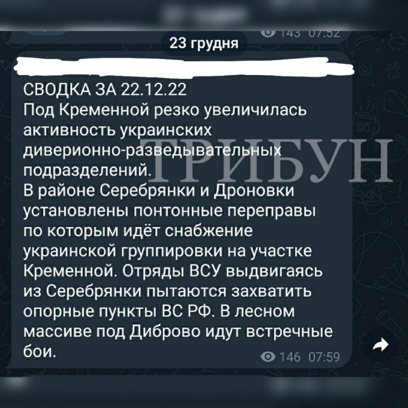 "Под Кременной резко увеличилась активность украинских ДРГ. В районе Серебрянки и Дроновки установлены понтонные переправы по которым идет снабжение украинской группировки на участке Кременной", - сообщают пропагандистские паблики.