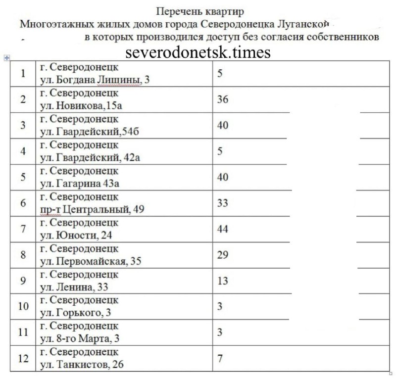 "Администрация города Северодонецка уведомляет о планируемом вскрытии жилого помещения и о необходимости явки собственника в администрацию города Северодонецка с целью предоставления согласия на вселение в жилое помещение сроком на 3 года или же отказе в предоставлении согласия на вселение. Список адресов прилагается", - говорится в сообщении.