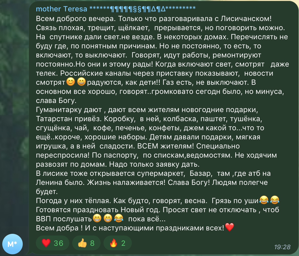Почему-то ситуация с неадекватно дорогими медикаментами и продуктами питания умалчивается, умалчивается и то, что лисичане сидят без воды, без отопления. Вместо этого, пытаются подать как большую "радость" возможность смотреть российские телеканалы и новогоднее поздравление президента РФ Путина. Такое ощущение, что раньше люди не знали, что такое интернет, и не могли смотреть то, что хотели и когда хотели. Теперь же просто нет выбора. Возникает только один вопрос: оно того стоило? Стоило ли то, что происходит в Лисичанске, тысяч сломанных жизней, десятков погибших мирных горожан?..