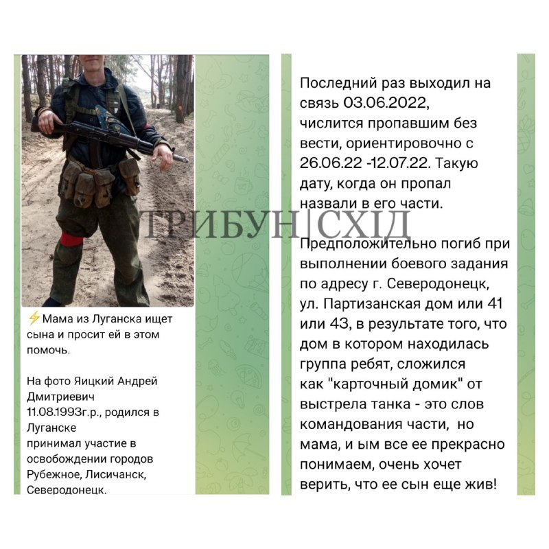"Последний раз мой сын выходил на связь 03.06.2022 года, числится пропавшим без вести, ориентировочно с 26.06.2022 по 12.07.2022 года. Предположительно погиб при выполнении боевого задания в городе Северодонецке по улице Партизанская дом 41 или 43", - пишет в сети женщина.