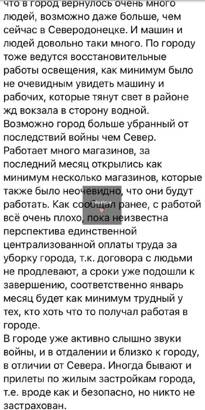 "Возможно город больше убранный от последствий войны чем Северодонецк. Работает много магазинов, за последний месяц открылись как минимум несколько магазинов. С работой все очень плохо, пока известна перспектива единственной централизованной оплаты труда за уборку города, т.к. договора с людьми не продлевают, а сроки уже подошли к завершению, соответственно январь месяц будет как минимум трудный у тех, кто хоть что-то получал. В городе уже активно слышно звуки войны, и в отдалении и близко к городу, в отличие от Северодонецка. Иногда бывают и прилеты, т.е. вроде как безопасно, но никто не застрахован", - сообщают местные жители.