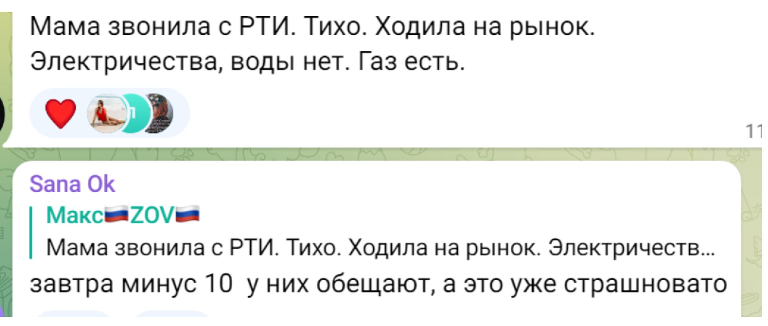 "Мама звонила с РТИ. Тихо. Ходила на рынок. Электричества, воды нет. Газ есть. Завтра минус 10 у них обещают, а это уже страшновато", - пишут в сети.