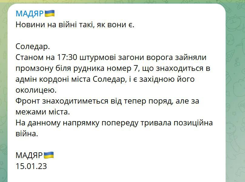 Таким образом, исходя из сообщения Мадяра, украинские войска оставили Соледар.