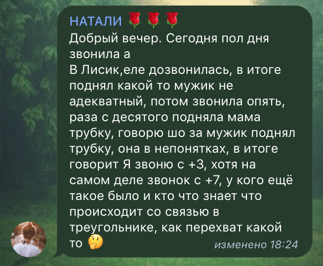 По словам пользовательницы сети, которая попыталась связаться с родственниками, трубку поднял "какой-то мужик неадекватный". Дивным образом произошла замена кода с "+3" на "+7". Родственники, к которым все же удалось дозвониться, понятия не имеют, что произошло - звонок к ним просто не прошел. Что происходит со связью - никто не знает.