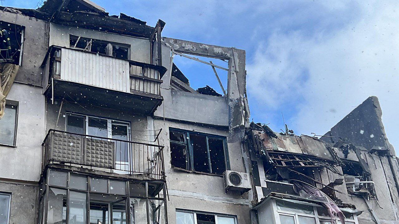 На месте попадания российской ракеты работают спасатели, продолжается разбор завалов. В соседних домах от взрывной волны вынесло стекла.
