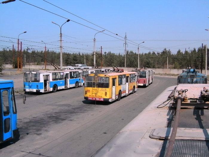 На фото - разрушенное троллейбусное депо. Троллейбусы так и остались стоять, некоторые - уже разъела ржавчина. Запустить их в работу, естественно, нет возможности, поскольку город сегодня не электрифицирован.