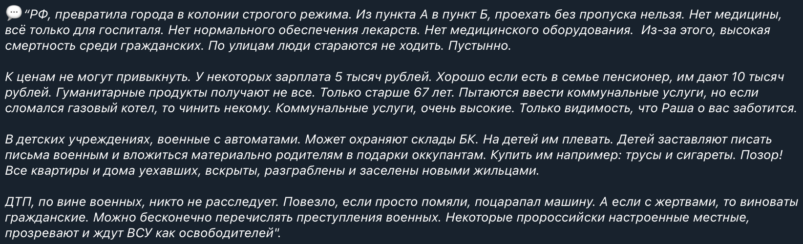 В регионе много российских военных. Пустующие дома и квартиры разграблены. Россияне бесчинствуют, а управы никакой нет. Даже те жители, которые раньше ждали РФ, прозрели и теперь ждут приход ВСУ.