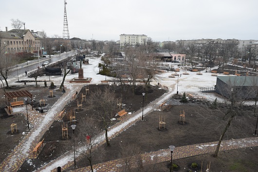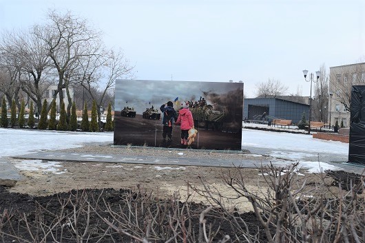 Сейчас сквер просто не узнать: дорожки разобраны, повсюду следы "освобождения" - воронки от "прилетов", конструкции с именами и патриотическими сюжетами опрокинуты на грязной земле, изуродованы здания вокруг.