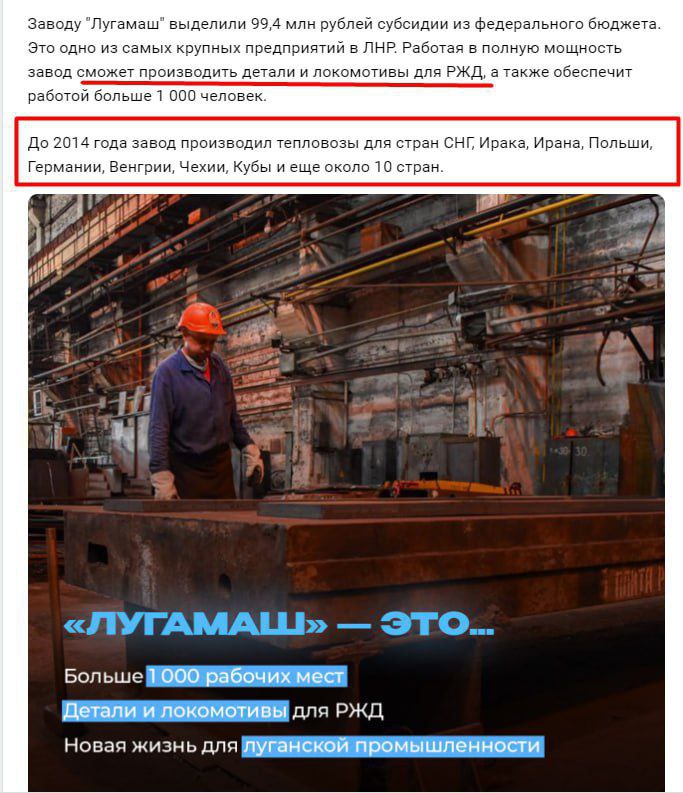 Но после прихода "освободителей" так называемая программа "интеграция" прошла в "ЛНР" таким способом, что несколько заводов, включая и Луганский тепловозостроательный завод, были разрезаны и вывезены в Россию.
