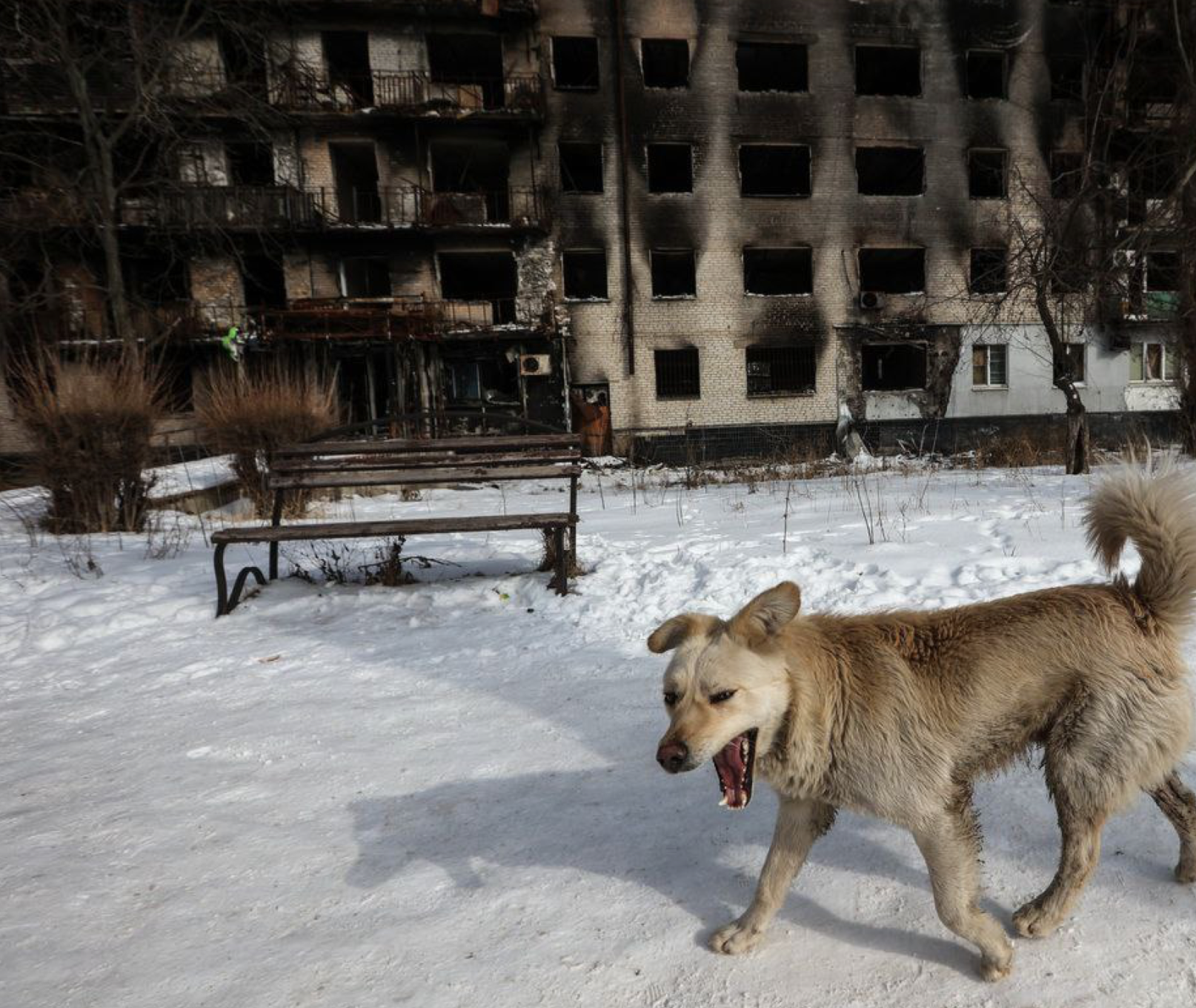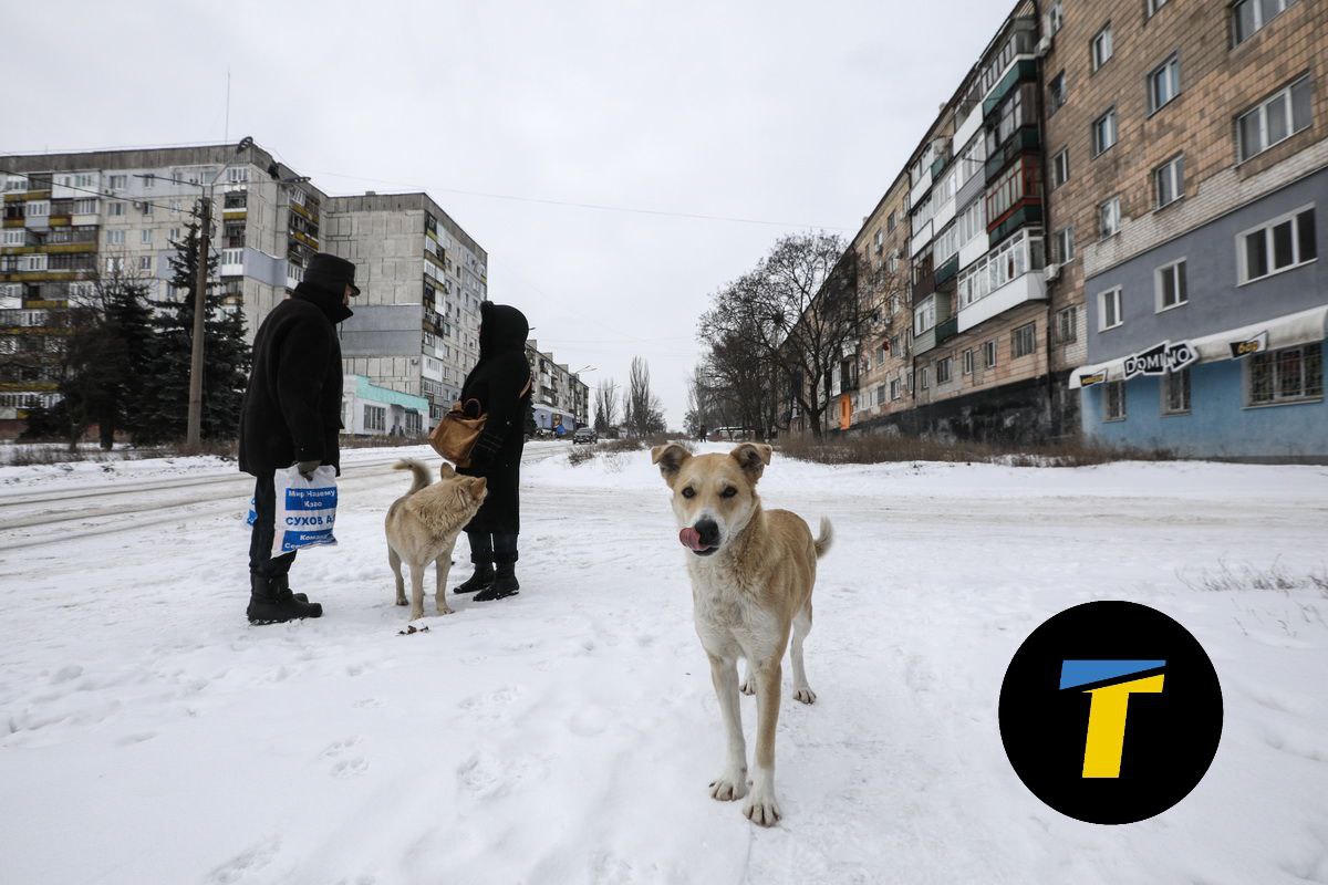 Фото датированы февралем текущего года. На улице еще снег. Первое, что бросается в глаза - серьезные разрушения. На одном из фото - разрушенный техникум, на втором - выгоревший многоэтажный дом. На улицах практически никого, только одинокие прохожие - пожилые люди. Молодежи в городе как будто нет. И не удивительно, ведь нет рабочих мест. А еще, очевидно, на улицах города много голодных бродячих собак.