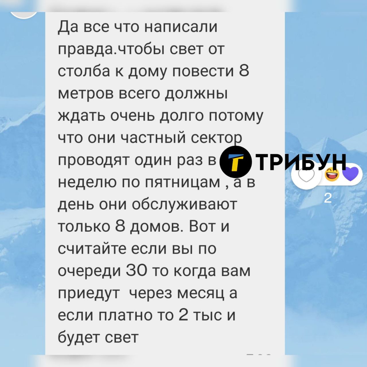 Как сообщают сами жители, чтобы провести свет от столба к дому нужно набраться терпения, ведь сделать это быстро не получится. Работники приезжают в частный сектор только раз в неделю. За этот день они обслуживают до 8 домов, то есть если желающие 30 по очереди - ждать не меньше месяца. Но есть вариант и для менее терпеливых - 2 тысячи российских рублей и свет подключат в ближайшее время.