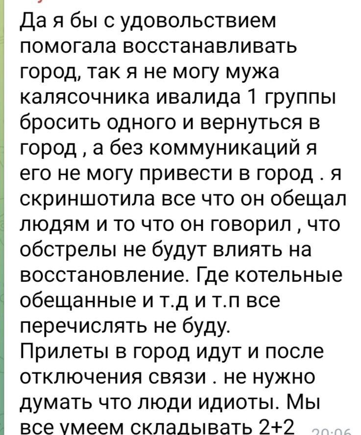 Возвращаться "домой" не все хотят, так как понимают, что без наличия коммуникаций жизнь в Лисичанске станет мучением. "Мэр" продолжает "обещать" котельные, "блага цивилизации" и прочее пока только на словах. Да и отсутствие мобильной связи не повлияло на прилеты в город.