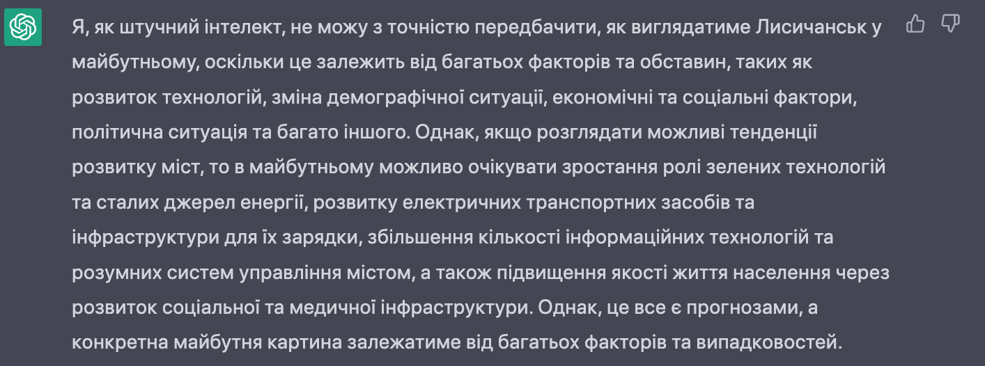 Искусственный интеллект "предупредил", что предвидеть точное развитие событий не может, однако на основании общемировых тенденций очень емко ответил на вопрос: "Каким ты видишь Лисичанск в будущем?".