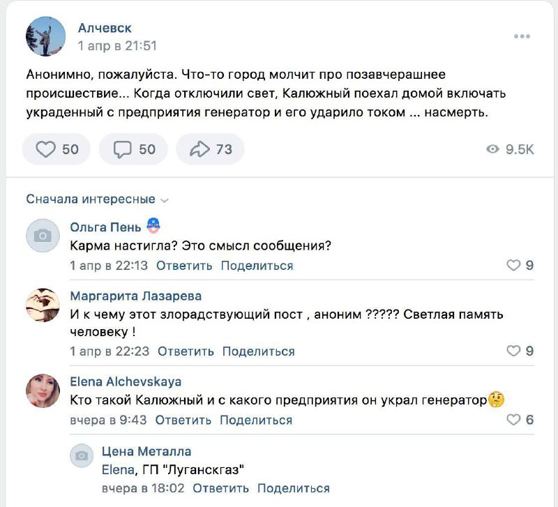 "Почему город молчит о случившемся. Когда выключили свет, Калюжный уехал домой, где включил краденый генератор и его убило током… на смерть".