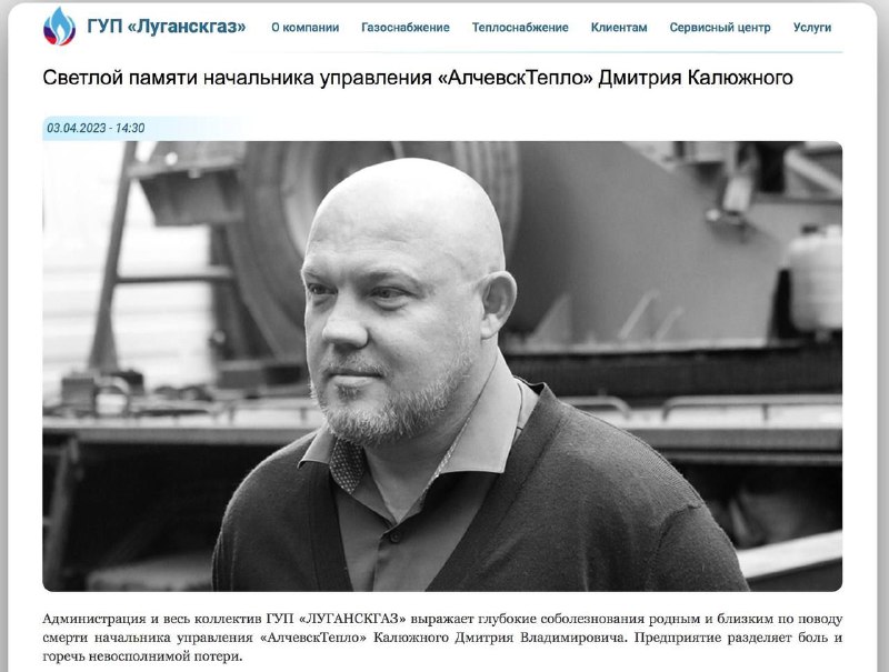 На сайте оккупированного предприятия "АлчевскТепло" появился некролог по поводу кончины так называемого начальника управления Дмитрия Калюжного.