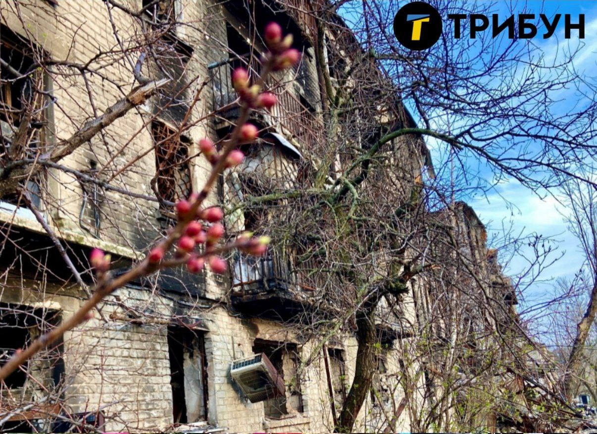 В город тоже пришла весна: трава стала зеленеть, на деревьях появились первые почки. Однако эту красоту омрачают руины города. На фото видно разрушенные дома с разбитыми окнами. Где-то от зданий не осталось почти ничего. А во дворах остаются обломки и мусор.