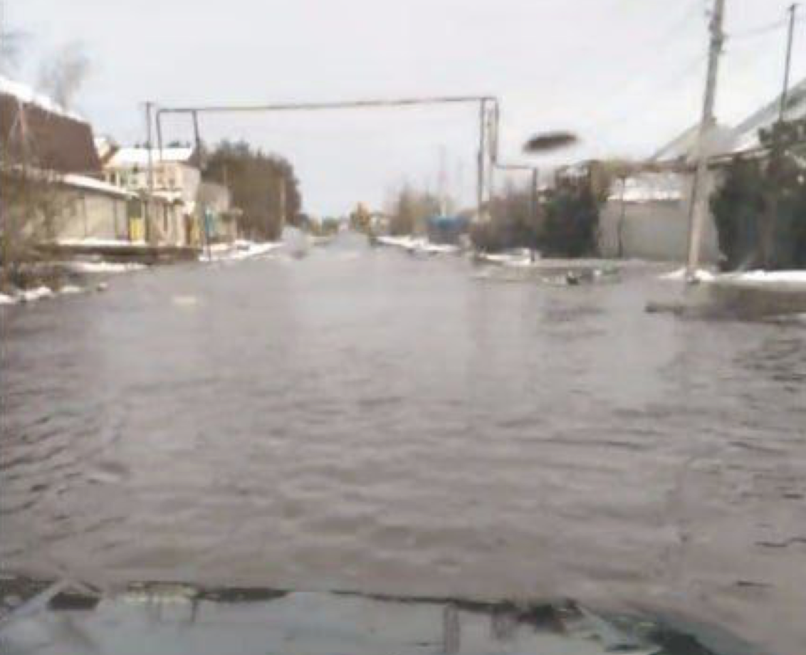 На кадрах - центральная улица поселка, которая сегодня выглядит больше похожей на речку, чем на улицу. Дома затоплены, движение транспорта, естественно, затруднено. Автомобиль фактически плывет по улице.