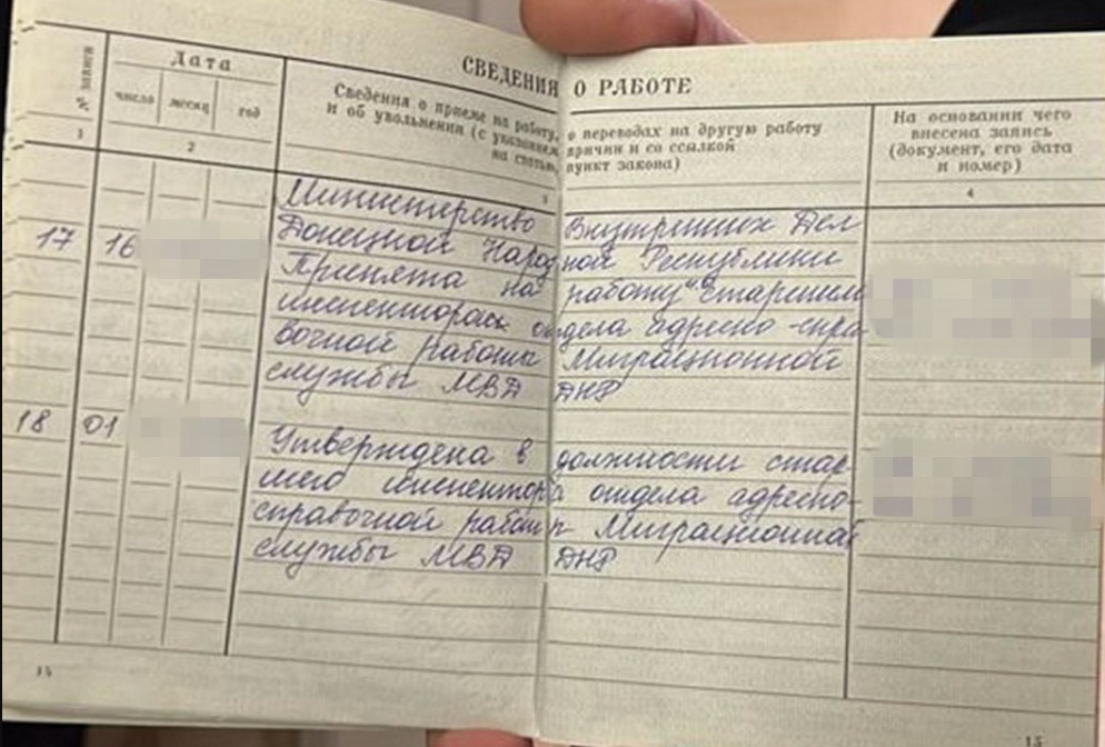 В начале полномасштабного вторжения РФ в Украину чиновница "МВД ДНР" переехала в Киев под видом переселенки с Донбасса. Во время обыска у нее обнаружена "трудовая книжка", свидетельствующая о ее пребывании в составе оккупационных органов.