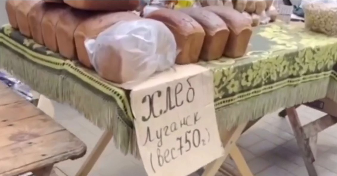 На нем видно, как люди торгуют сейчас. Кажется, что жизнь на оккупированных территориях вернулась на много лет назад. Различные товары находятся на столах, названия продуктов указаны на картонных табличках.