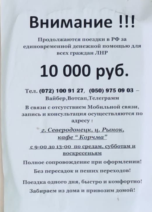 На объявлениях, которые висят по городу, сообщается, что жители Северодонецка могут записаться на консультацию и поездку за "денежной помощью" в кафе на центральном рынке "Корчма".