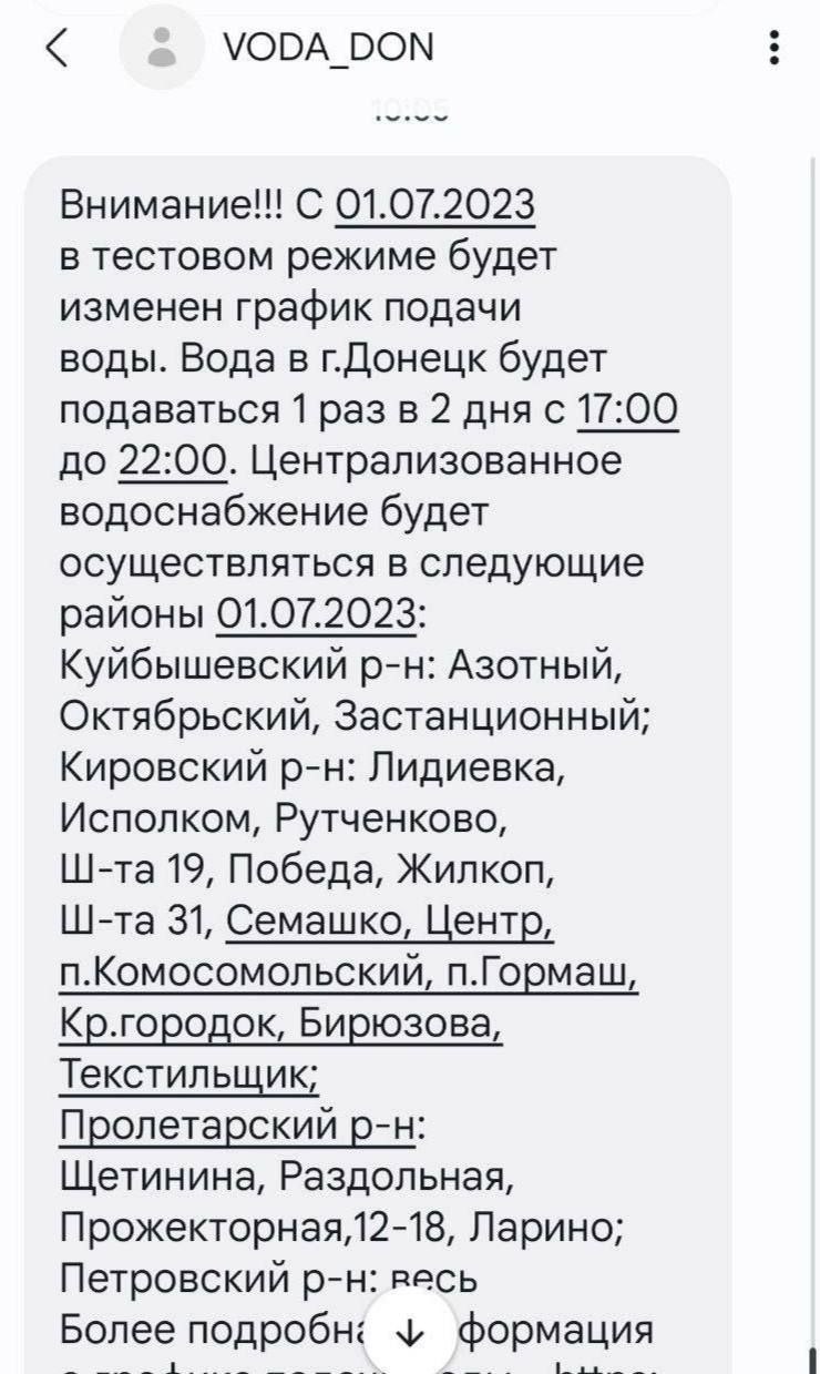 Как можно понять из нового графика, вода в кранах жителей Донецка будет как и прежде появляться только в определенные часы определенных дней. Огромный город вынужден подстраиваться под график и ждать, пока благо цивилизации будет подано хоть на несколько часов.