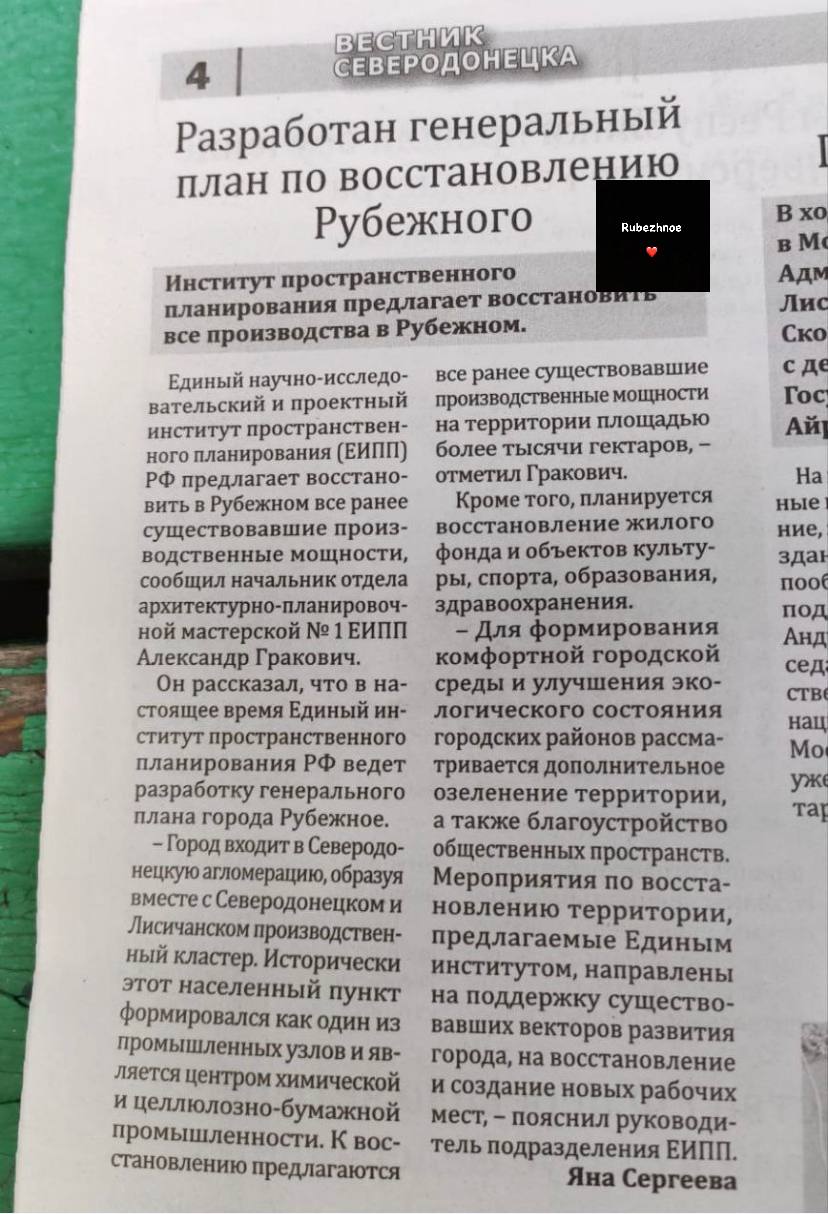 Институт пространственного планирования РФ работает над так называемым "генеральным планом восстановления" Рубежного. В частности, планируют отремонтировать все местные предприятия. В материале также говорится о восстановлении жилищного фонда, объектов культуры, спорта и т.д.