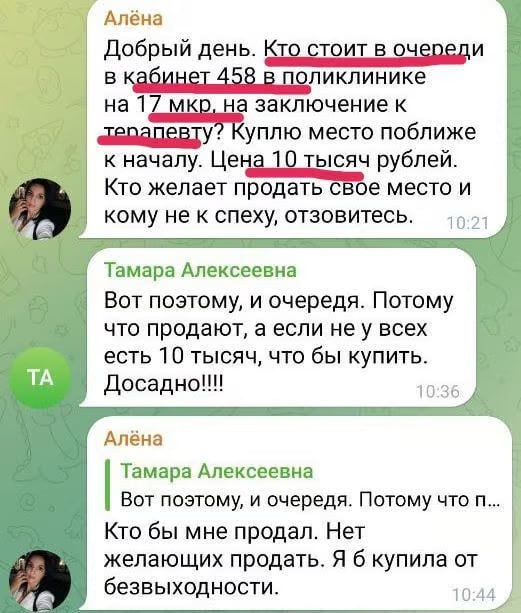 Одна из участниц переписки написала, что готова приобрести очередь к терапевту за 10 тысяч рублей. Вторая жительница города отреагировала на предложение женщины критикой.