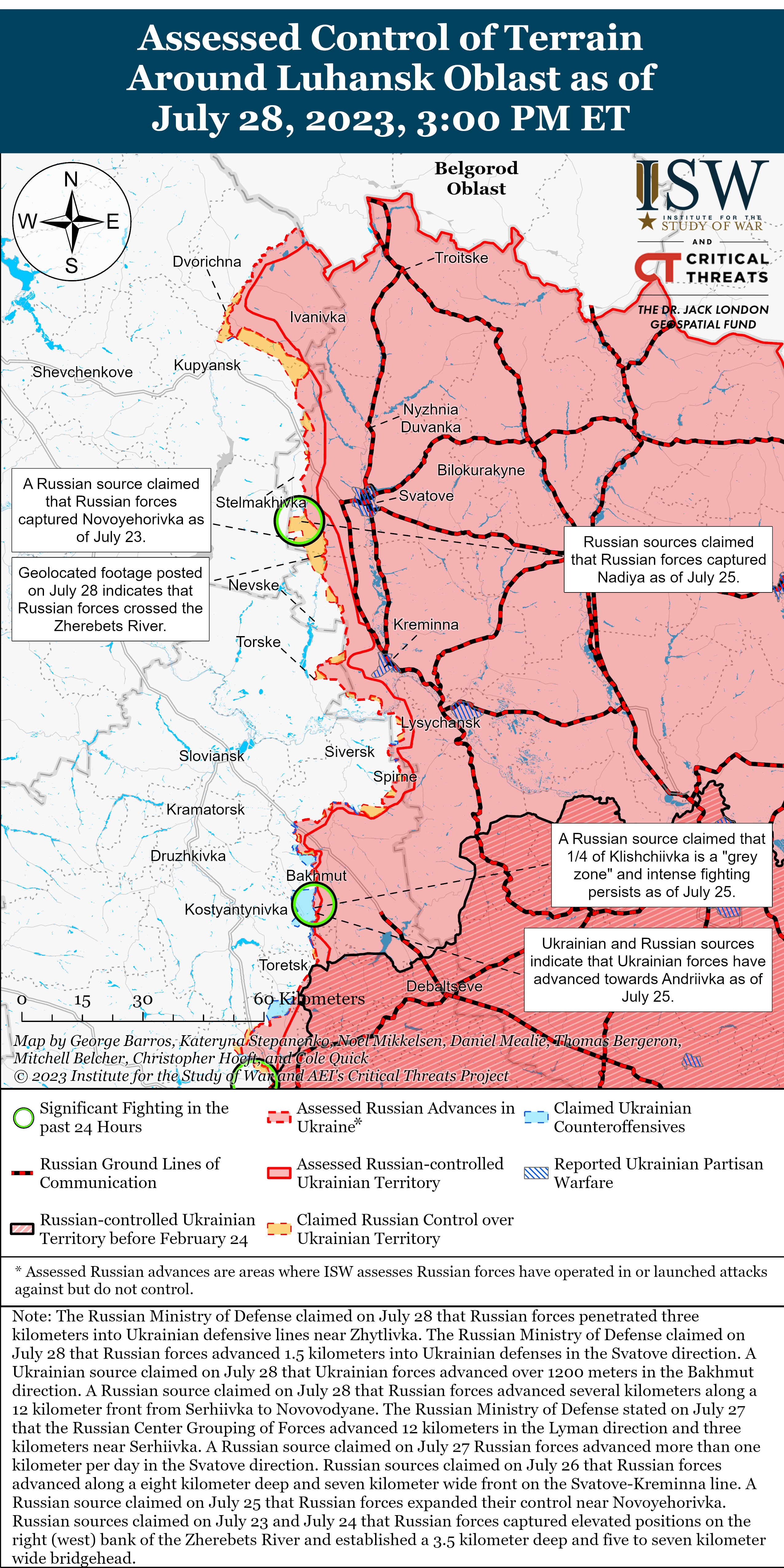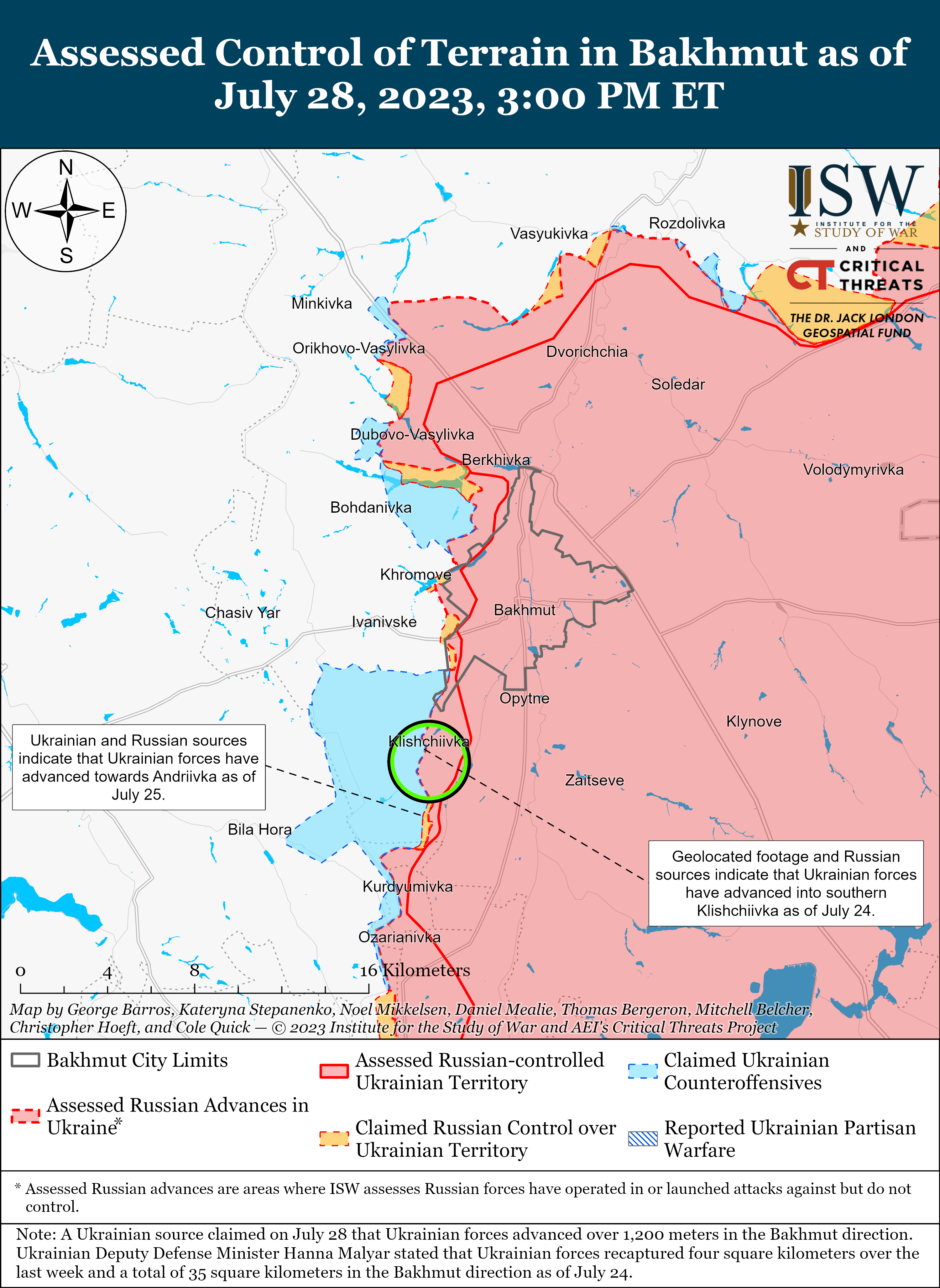 Генштаб Украины 28 июля сообщил, что продолжаются бои к северу от Бахмута и к югу от Бахмута вблизи Клещеевки, Курдюмовки и Андреевки (все в 5-11 км к югу от Бахмута).