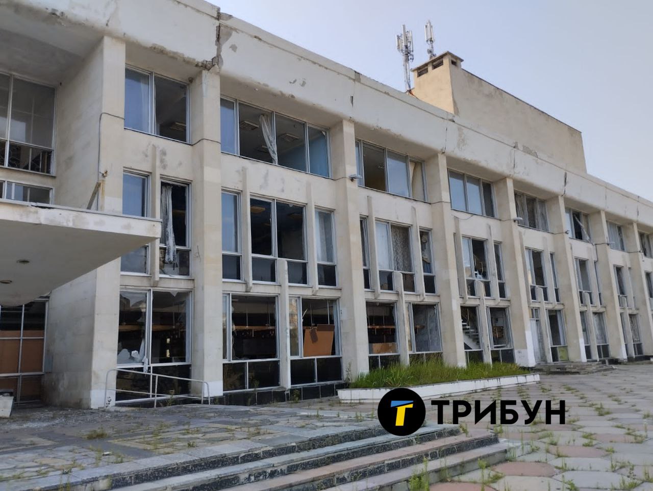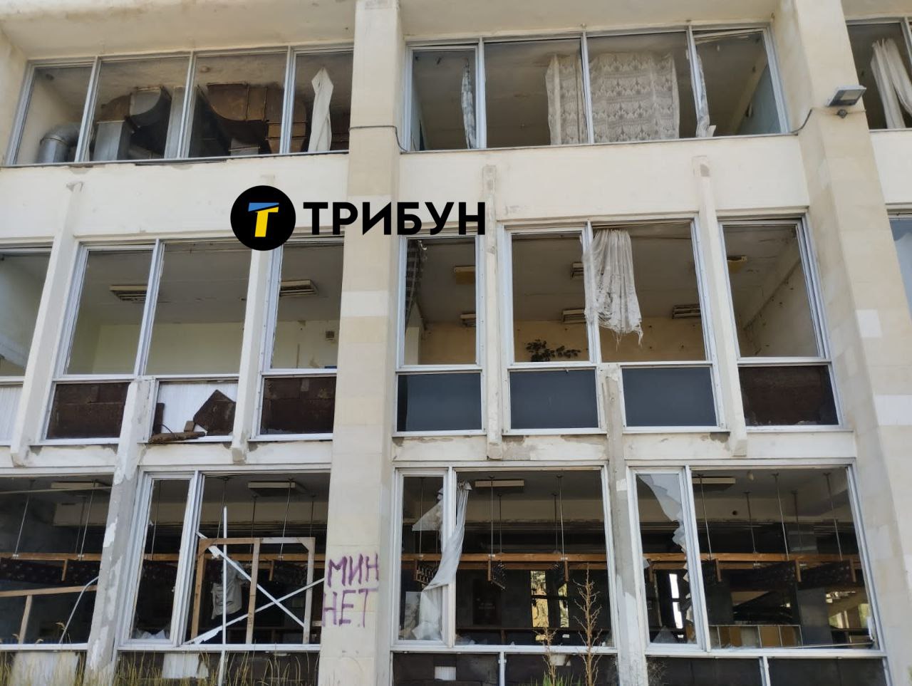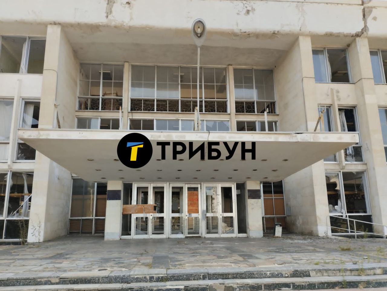 На стене надпись: "Мин нет". До российского вторжения никому и в голову не могло прийти, что в Дворце культуры могут быть мины. Зато теперь на ступенях красуется "стела" с российским триколором, как символом разрушения, которое армия РФ принесла городам региона.