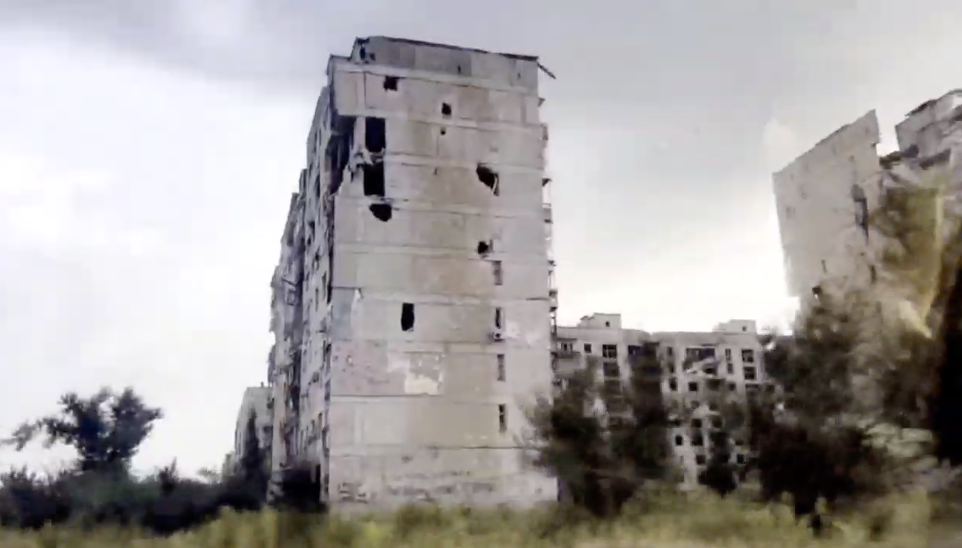 Видео начинается со въезда в город. Естественно, стела перекрашена в цвета российского триколора. А дальше начинается то, что этот триколор символизирует, - полное опустошение и разруха. Многоэтажные дома получили серьезные повреждения. Они фактически непригодны для проживания. Примечательно, что руины не показывают на пропагандистских видео из Северодонецка, а они есть и их много. Серьезные восстановительные работы не проводятся, местами даже завалы остаются лежать второй год.