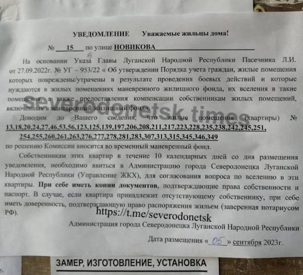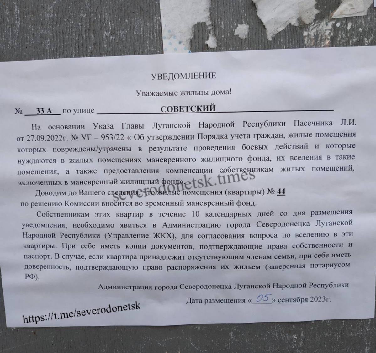 В Луганской области российские оккупанты активно занимаются созданием "маневренного жилищного фонда", целью которого является простая ликвидация права собственности. Так, на домах в Северодонецке появились объявления о внесении квартир горожан в "маневренный фонд".