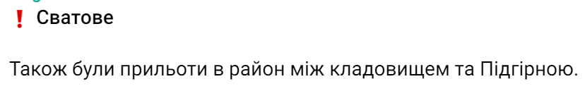 "Сватово, по городу было 10 прилетов вчера. О разрушениях и пострадавших неизвестно".