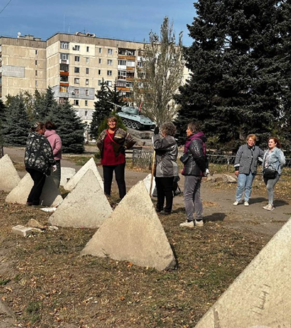 На кадре - центральна часть города, район танка. Территория плотно заставлена "зубьями дракона". Вокруг "инсталляции" собрались местные жительницы, пожилые женщины. Что за мероприятие проходило и какова цель установки защитных сооружений в хаотичном порядке в центральной части Лисичанска - остается загадкой.