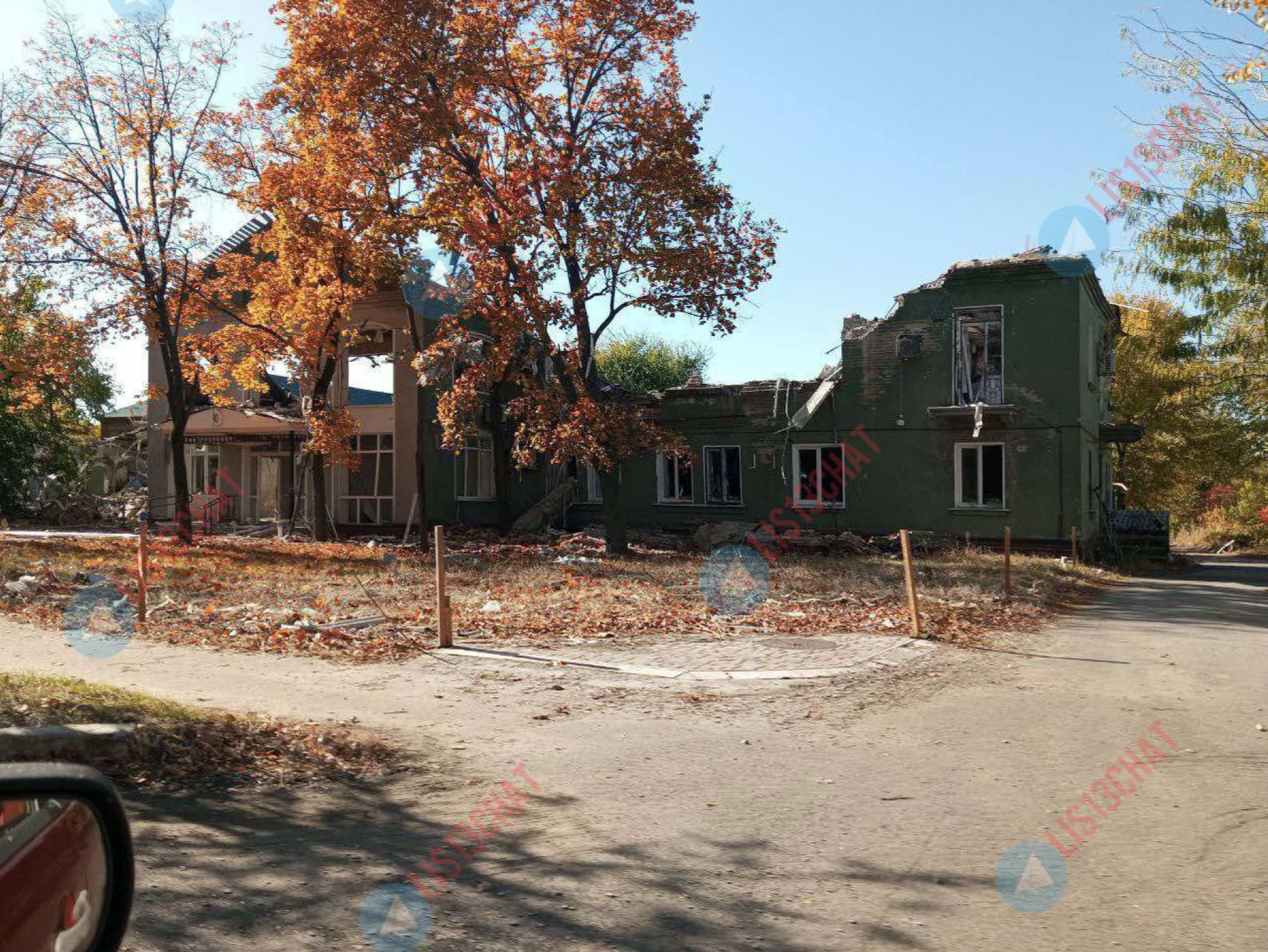 В осеннем Северодонецке ситуация аналогичная. Город также пуст, листья никто не убирает. Видны дома, которые пострадали в результате обстрелов. На улицах, несмотря на хорошую погоду, нет никакого движения.