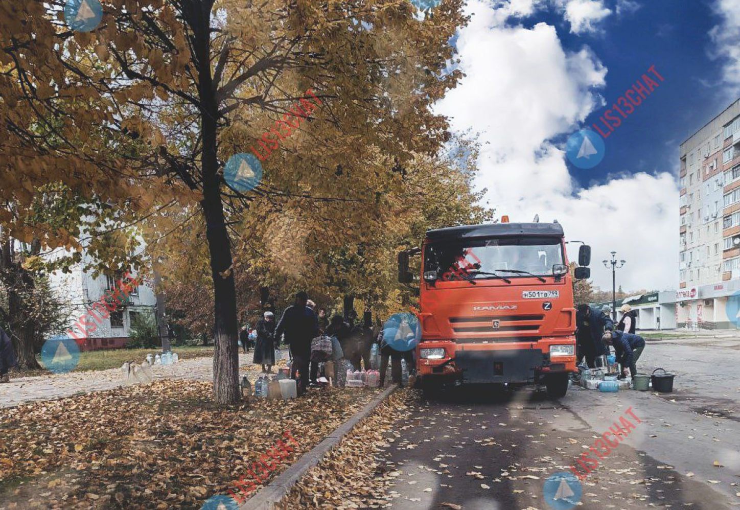 На первом фото - показан осенний Лисичанск. В городе практически отсутствует центральное водоснабжение, поэтому люди делают запасы воды тогда, когда выпадает возможность набрать ее во время развозки. Очередь нельзя назвать большой. Видимо, в городе людей не так много, как заявляют оккупанты.