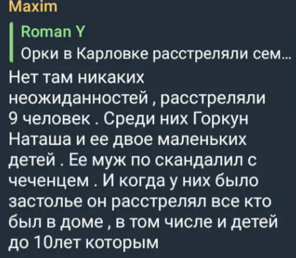 "Они собрались вместе на празднование дня рождения 27 октября у местной жительницы Натальи Горкун. Днями ранее ее зять Андрей Капканец поругался с кадыровцами, которые пытались отжать его дом. Кадыровцы решили отомстить. Ворвались прямо в разгар семейного застолья и убили всех, кто на нем присутствовал, включая маленьких детей", - написал журналист.