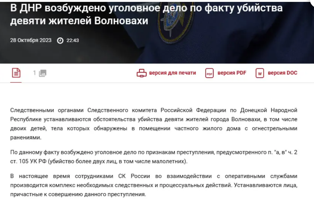 Информацию об убийстве девяти жителей Волновахи, среди которых двое детей, 28 октября опубликовали сами же оккупанты. Следственный комитет РФ утверждает, что тела обнаружили в помещении жилого дома. У каждого из погибших зафиксировали огнестрельные ранения.