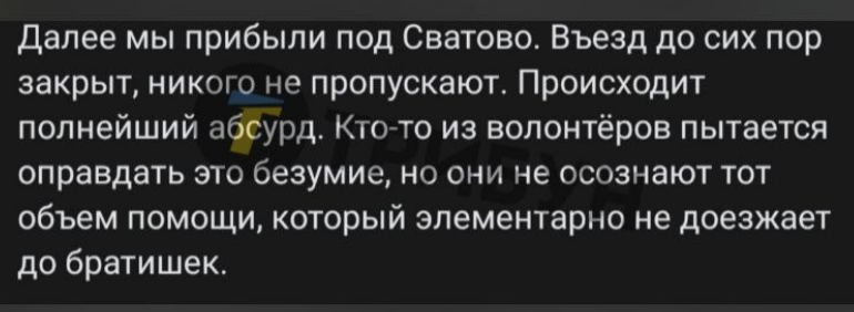 "Волонтеры", занимающиеся доставкой "гуманитарной помощи" для захватчиков пишут, что не могут попасть во временно оккупированное Сватово – для людей с русской/неместной пропиской въезд в населенный пункт закрыт.